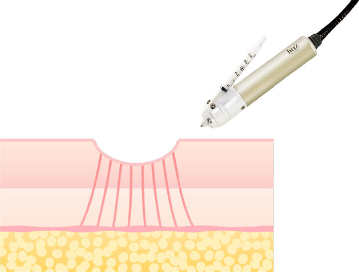ニキビ跡のへこみや傷跡・刻まれたしわの原因となる、線維化した組織を断ち切りながら(マイクロサブシジョン)薬剤を注入することで凹みの改善が期待できます。 -